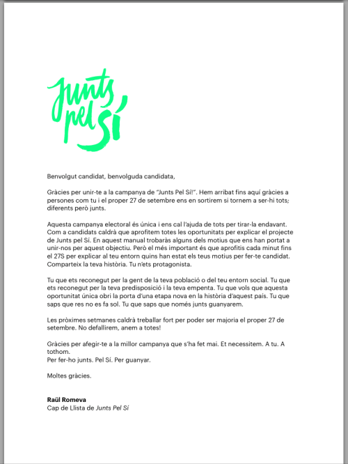 Encarem un dels moments més decisius del procés d’independència de Catalunya. Fins ara s’han acumulat forces —això que anomenen base social sobiranista— i s’han explorat totes les vies per a un referèndum acordat amb l’estat espanyol. L’acumulació de forces ha progressat adequadament —i caldrà comprovar si ha estat suficient el 27-S—, però l’exploració de diàleg ha de millorar. Bé, més que millorar, s’ha comprovat que dos no dialoguen si un no vol. Per tant, s’ha pres la decisió correcta: tirar pel dret per la via democràtica i pacífica.