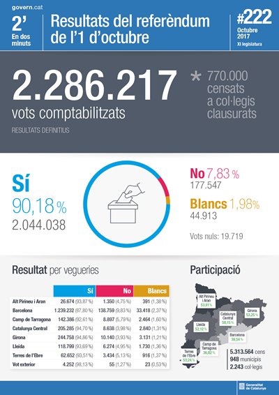 Les manifestacions han sigut gairebé constants des de l’Onze de Setembre, i especialment des del dia 20, quan la Guàrdia Civil va detenir els alts càrrecs del Govern que estaven preparant el referèndum. Aquell dia la indignació es barrejava amb l’esperança per l’1-O. El dia 3, amb l’aturada general, el dolor dels cops de porra s’alleujava amb l’alegria d’haver votat. Però ahir la ràbia predominava als carrers, i el sentiment d’haver sigut humiliats pel govern espanyol predominava. “Llibertat, llibertat”, va ser el clam de la ciutadania. La demanda de l’independentisme és clara: que els polítics declarin de seguida la independència.