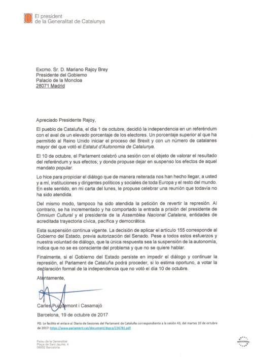 Rajoy, doncs, ofega l’autogovern català i no dona cap marge de diàleg a Puigdemont. Tot i que en la seva última carta el president de la Generalitat li deixava clar que no s’havia votat la independència i reiterava la seva voluntat de parlar, el president espanyol va insistir en l’argumentari per justificar el 155, per frenar un procés “unilateral, contrari a la llei i que busca l’enfrontament” i “tornar la convivència i la legalitat” a Catalunya.