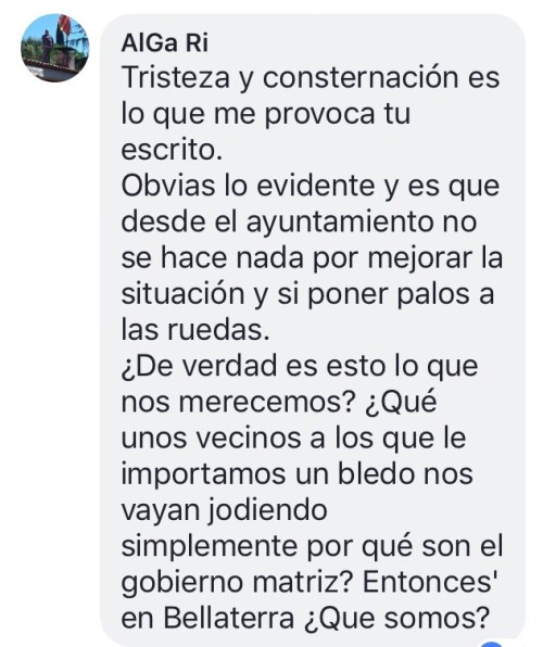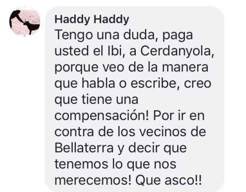Vaig sentir la mateixa EMPATIA pels nostres problemes, com quan va venir la Regidora de Seguretat, la Sra. Contxi Haro i vam quedar, amb un pam de nas, quan va marxar tot dient que se l’hi havia faltat al respecte, quan una veïna i va dir, que s’hauria de veure en el mateix tràngol.