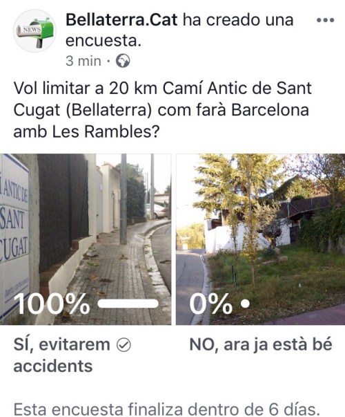 Demanem al president Ramon Andreu i al govern municipal de l’EMD de Bellaterra segueixi prenent totes les mides posibles per la seguretat del nostre poble i aconseguir el traspàs de la carretera BV 1414 per limitar el pas de milers de cotxes pel mig de Bellaterra. El Camí Antic de Sant Cugat a Sabadell ha de pasar a ser un camí de passeig pels mostres veïns i no pas travessia per foranis que només volen guanyar temps i evitat pasar per l’AP7.