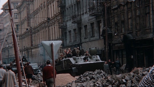 Torno a l’hotel a recarregar la càmera. Em creuo amb el Plàcid, que amb la seva màquina també està ficat enmig del rebombori. Un vell aixeca el bastó i crida: “Visca la República!” Un grup d’obrers, quan reconeixen que soc estranger, em diuen expressivament “Komunism, disaster”. Quan torno, un jove patriota enfilat en un tanc s’escarrassa per lligar amb un cinturó la tapa de la torreta davant de les aclamacions del públic. El tanc posa en marxa amb escàndol el motor d’olis pesants, i el noi, espantat, salta a terra. S’hi enfila un altre amb un ganivet a la mà. Un company intenta impedir-l’hi agafant-lo del braç, però aconsegueix desfer-se’n i talla el cinturó. S’obre la porta de la torreta i apareix en tanquista soviètic sota les increpacions del públic. Pel cel segueixen passant els grans avions de transport; la cadena l’interromp, de tant en tant, el vol rasant dels MIG, en una patent demostració del Poder Soviètic.
