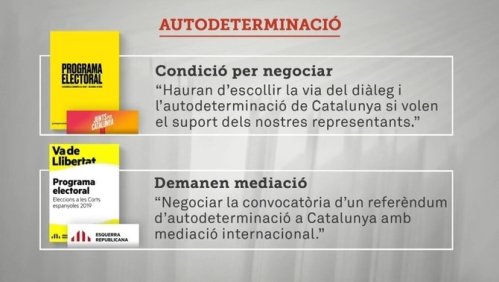 Ara bé, què diuen sobre l’autodeterminació? Hi ha matisos. Mentre que Junts per Catalunya posa el reconeixement d’aquest dret per negociar i que s’haurà d’escollir la via del diàleg, Esquerra demana negociar un referèndum amb mediació internacional.