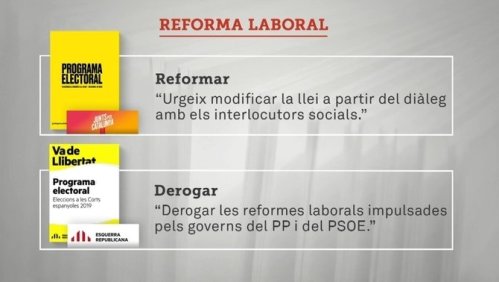 Sobre la reforma laboral, Junts per Catalunya la vol reformar, mentre que Esquerra directament opta per derogar-la.