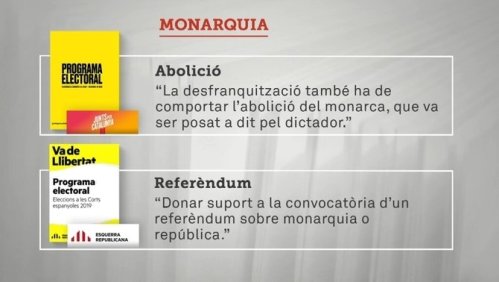 Sobre la monarquia, JuntsxCat en vol l’abolició, i els republicans donen suport a un referèndum sobre monarquia o república.