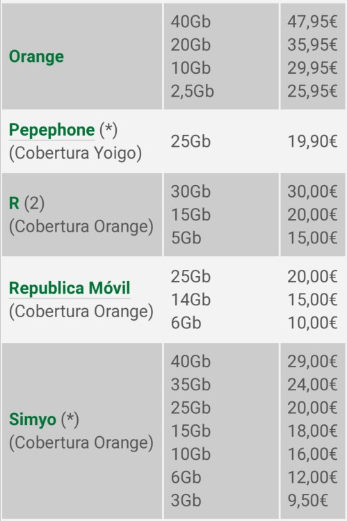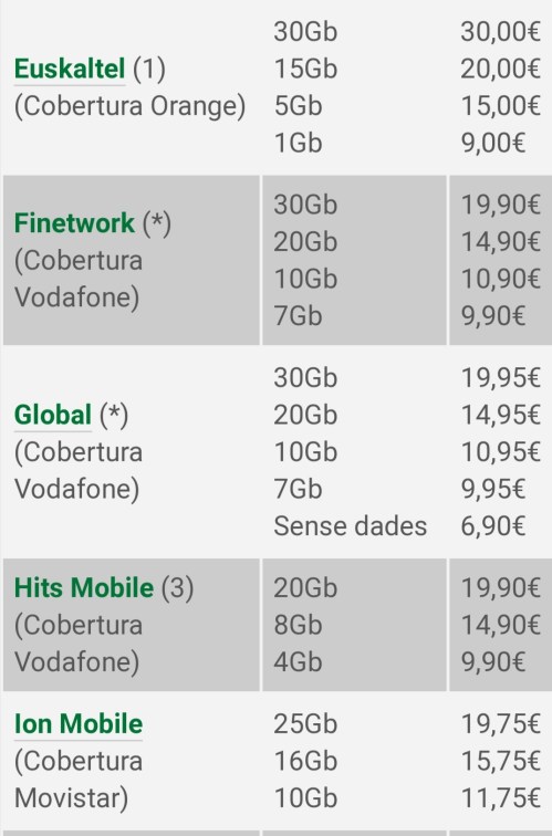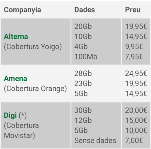 Entre les ofertes amb dades a preus més baixos destaquen 7,99 euros mensuals de Suop amb 3GB i els 9 euros de Xenet amb 8 GB, mentre que entre les ofertes amb trucades i sense dades hi ha els 6,50 euros de Xenet, els 6,90 euros de Global, els 6,99 euros de Suop i els 7 euros de Digi. D’altra banda, entre les tarifes més cares amb trucades il·limitades hi ha les de Movistar, amb 45 euros mensuals i Orange amb 35,95 euros –ambdues ofereixen 20 GB de dades- i Vodafone, sense límit de dades, per 49,99 euros.