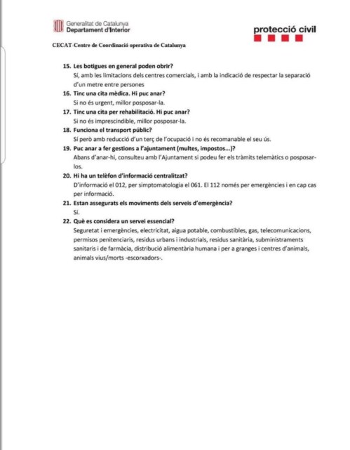 Seguretat i emergències, electricitat, aigua potable, combustibles, gas, telecomunicacions, permisos penitenciaris, residus urbans i industrials, residus sanitària, subministraments sanitaris i de farmàcia, distribució alimentària humana i per a granges i centres d’animals, animals vius/morts -escorxadors-.