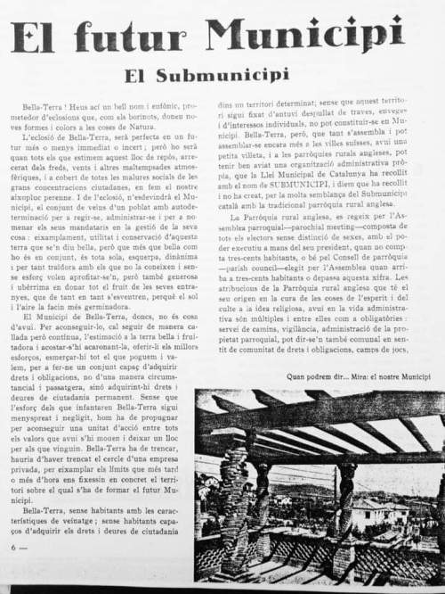 I l’existència de Bella -Terra és obligada si hom vol conservar un petit lloc de sojorn amable, rialler i pròdig enmig dels dos grans nuclis urbans engolidors de ciutadans, que de prop ens assetgen: Barcelona, capital de la nostra estimada Catalunya, com totes les grans capitals, fàcil al platxeri i de més a més a les lluites socials d’una gran ciutat oberta a tots els corrents immigratoris; i Sabadell, la nostra cara Sabadell, ciutat inquieta, que de tant inquieta és un perill de perdre la fesonomia pròpia amb l’emigració dels seus fills Milà immigració de pobles transhumants, transformar-la en un barri concretament industrial, en un d’aquells sengles carrers de la Barcelona medieval, i sense la contrapartida, de vegades, per molt que primfili, favorable de la gran ciutat mediterrània. L’estímul de la Llei Municipal Catalana, cal aprofitar-lo. Anem per ara, tot seguit, al SUBMUNICIPI, mentres la formiga feinadora treballem per un futur MUNICIPI.