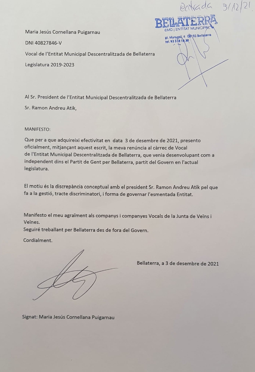 Avui dimarts, 7 desembre, acabem de consultar a la web oficial de l’EMD: http://www.emdbellaterra.cat, i hem vist que després de la renúncia política del 3 de desembre, la vocal independent Chus Cornellana, segueix aparèixent com vocal del govern de Ramon Andreu (GXB). La retirada del nom de la vocal Mei Barceló va ser fet al mateix moment, just abans del ple de la Junta de Veïns de l’EMD.