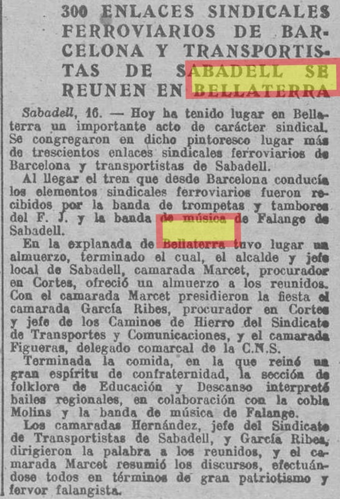 La trobada franquista es va celebrar a l’esplanada de Bellaterra, el diumenge 16 de maig de 1943, participant Vicente García Ribes i la Banda de Música de Falange de Sabadell.