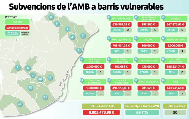 La concentració d’aquests factors de risc propicia la retroalimentació, perpetuant els riscos d’exclusió de la població resident en aquests barris. Aquesta situació es manifesta de manera intensa als eixos del Besòs i el Llobregat, segons assenyalen els responsables de l’AMB. La majoria dels catorze municipis que han estat seleccionats han presentat un projecte, tret de Cornellà, que n’ha presentat dos, i de Barberà del Vallès i Gavà, que n’han presentat tres cadascun. La convocatòria de les bases ja fixava un límit d’un milió d’euros de despesa finançable per l’Àrea Metropolitana de Barcelona.