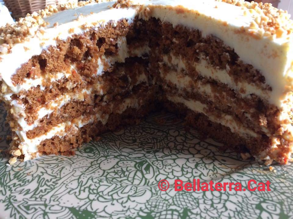 ⮕ Afegeix la ratlladura de pastanagues, la pols d’ametlla, la farina i el llevat químic barreja. A continuació, les nous triturades i les espècies. Torna a barrejar.