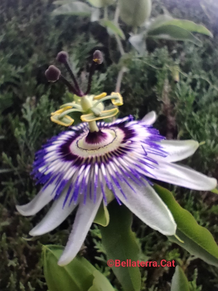 La flor és complexa i fragant d’uns 10 cm de diàmetre, amb 5 sèpals i pètals blanquinosos i una corol·la amb filaments blaus o violats i cinc estams verds groguencs amb tres estigmes purpuris. En climes tropicals floreix tot l’any, en climes mediterranis ho fa des de la primavera a la tardor. Fa el fruit en drupa de color taronja de 6 cm de llarg per 4 de diàmetre.