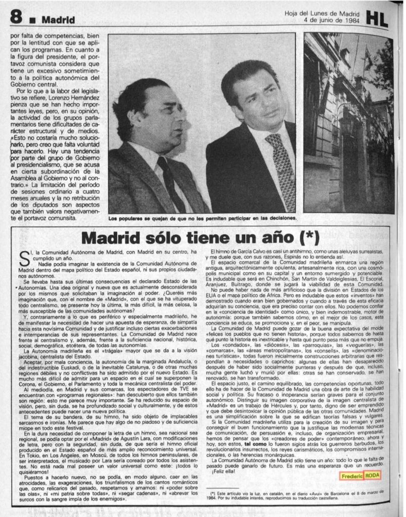 Es portava fins a les últimes conseqüències el declarat Estat de les Autonomies. Una idea original i nova que és actualment desconsidereu pels mateixos que sol·licitaven la imaginació al poder. Voleu més imaginació que, amb el nom de Madrid», amb què s’ha vituperat tot centralisme, es presenti avui l’última, la més difícil, la més gelosa, la més susceptible de les comunitats autònomes? I, contràriament al que és perifèric i especialment madrileny, he de manifestar la necessitat de fer una aposta d’esperança, de simpatia cap a aquesta novisima Comunitat i de justificar fins i tot certes exacerbacions i intemperàncies dels seus representants. La Comunitat de Madrid neix davant del centralisme i, a més, davant de la suficiència nacional, històrica, social, demogràfica, etcètera, de totes les autonomies. L’Autonomia madrilenya és l’empassa-la més gran que es dóna a la visió jacobina, centralista de l’Estat. Acceptar, per mala consciència, l’autonomia de la marginada Andalusia, o de l’indestructible Euskadi, o de la inevitable Catalunya, o de moltes altres