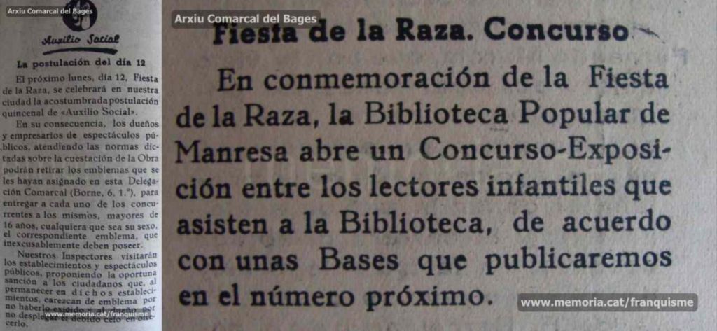 “Manresa”, 6/10/1942: “Fiesta de la raza. Concurso”. Anunci de la celebració d’un concurs entre lectors infantils en motiu de la Fiesta de la Raza i de l’obligació de la ciutadania de mostrar un emblema lliurat per l’Auxilio Social durant la diada: “Nuestros Inspectores visitarán los establecimientos y espectáculos públicos, proponiendo la oportuna sanción a los ciudadanos que […] carezcan de emblema por no haberlo exigido y al dueño por no desplegar el debido celo en exigirlo”. (Arxiu Comarcal del Bages).