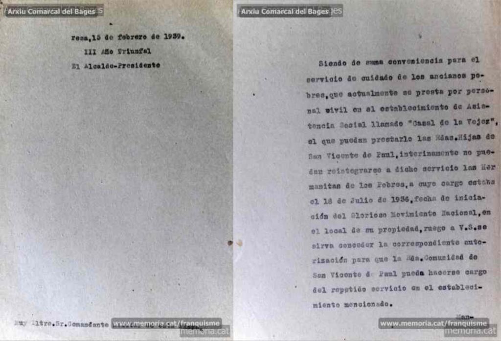 15/02/1939: demanda de l’alcalde de Manresa al comandant militar local per tal que autoritzi a les monges de la comunitat de Sant Vicenç de Paül a encarregar-se del “Casal de la Vejez”, institució dedicada a l’atenció dels ancians pobres, que fins llavors era regentada per civils. (Arxiu Comarcal del Bages)