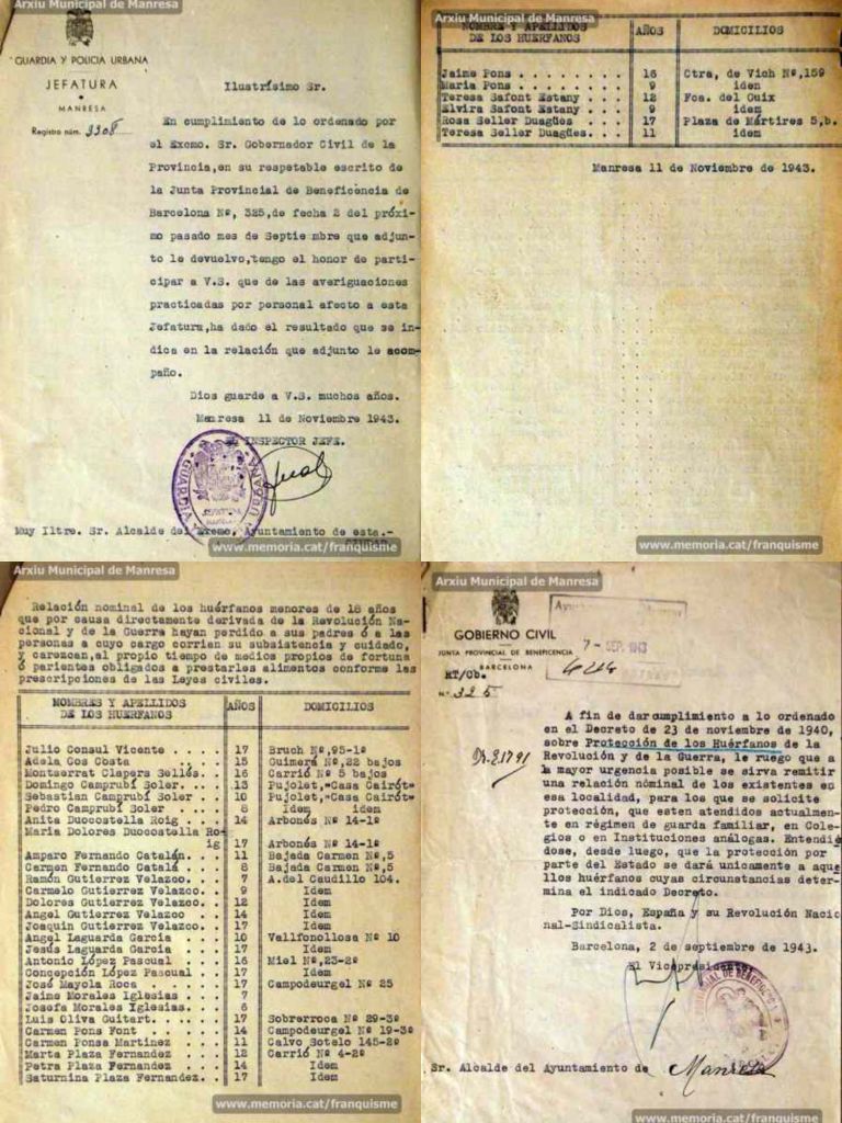 Setembre-novembre de 1943: petició a l’alcalde de Manresa del vicepresident de la “Junta Provincial de Beneficencia de Barcelona“, perquè li enviï la relació nominal d’orfes que té la ciutat, per tal que estiguin atesos. La demanda s’acompanya d’una llista amb els noms, l’edat i el domicili de més de trenta infants orfes de Manresa. L’informe, tramès a l’alcalde, ha estat elaborat per l’inspector en cap de la guàrdia i policia urbana. (Arxiu Municipal de Manresa)