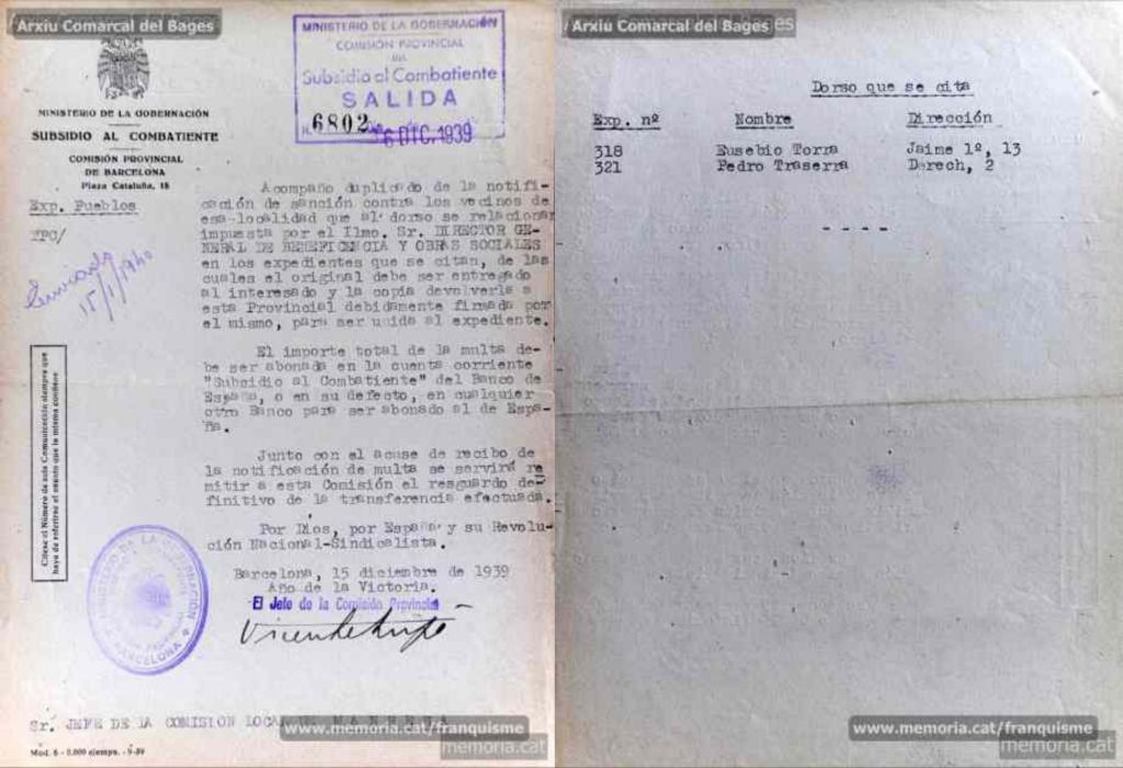 15/12/1939: notificació del Jefe de la Comisión Provincial del Subsidio al Combatiente al Jefe de la Comissión local de la mateixa institució d’una sanció imposada pel Director General de Beneficiencia y obras sociales contra alguns veïns de Manresa. S’acompanya d’un llistat amb dos noms de persones multades. (Arxiu Comarcal del Bages)