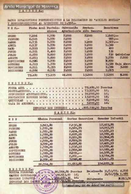 18/4/1959: dades estadístiques de la delegació manresana d’Auxilio Social corresponents a l’exercici de 1958, segons les quals les despeses, de 210.503,7 pessetes, superen els ingressos, de 208.590 pessetes. (Arxiu Municipal de Manresa)
