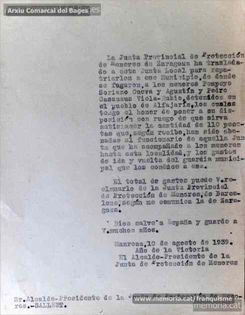 10/8/1939: carta de l’alcalde al seu homòleg de Sallent en què li comunica que la Junta Provincial de Protección de Menores de Saragossa ha portat a Manresa, amb l’objectiu de repatriar-los a Sallent, uns joves orfes que fugiren del seu poble. També reclama satisfer la quantitat de 110 pessetes per les despeses ocasionades pel trasllat. (Arxiu Comarcal del Bages)