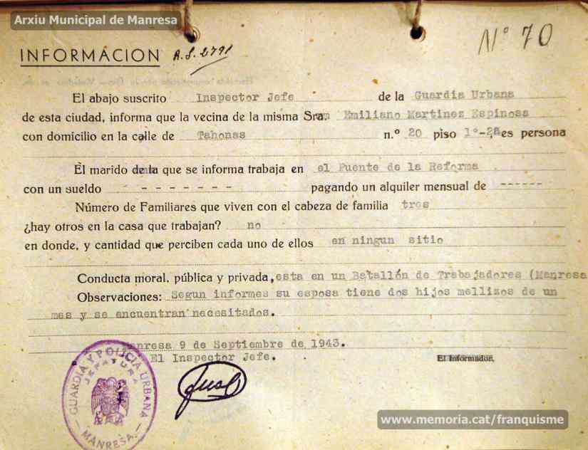 9/09/1943: informe de l’inspector en cap de la Guàrdia Urbana de Manresa sobre Emilià Martínez Espinosa, darrer alcalde de la Manresa republicana, que està en un Batalló de Treballadors construint el pont de la Reforma. El document assegura que la seva dona i fills estan necessitats. (Arxiu Municipal de Manresa)