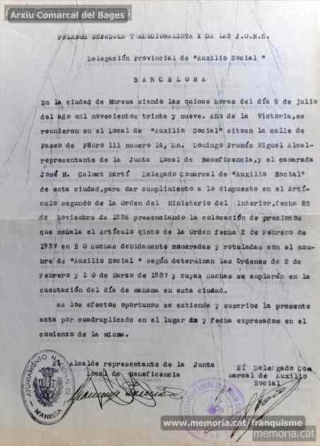 8/07/1939: acta de la delegació provincial d’Auxilio Social de Barcelona en què es fa constar la col·locació de precintes a cinquanta guardioles de Manresa, que serviran per recaptar diners per a la institució. (Arxiu Comarcal del Bages)
