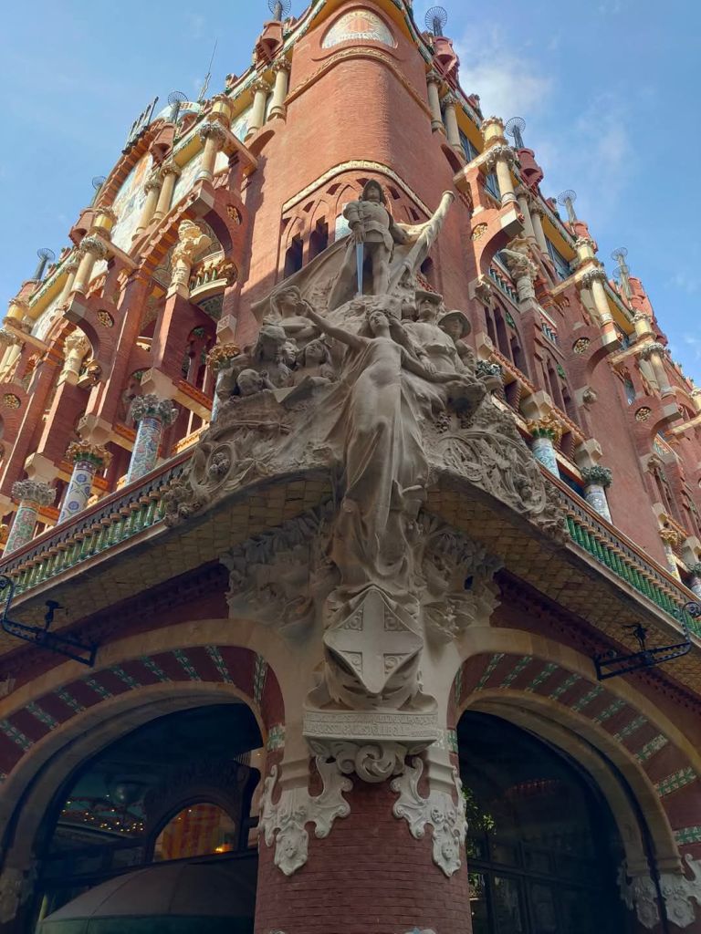 La façana del Palau, situada al carrer de Sant Pere Més Alt, únic accés fins a l’any 1989, fa cantonada amb el carrer d’Amadeu Vives, que es resol amb la inclusió del grup escultòric La cançó popular catalana, de l’artista Miquel Blay i reproduïda a mida superior al natural per Frederic Bechini, on estan representats un sant Jordi, sota una figura femenina al centre com un gran mascaró de proa, que és una al·legoria de la música, envoltada d’un grup de personatges que representen el mariner, els camperols, l’ancià i els nens. És considerada l’obra cabdal de l’escultor Blay, amb una sensibilitat social i un conjunt de gran harmonia. Tal com consta en una inscripció al peu de l’escultura, va ser pagada pel marquès de Castellbell (Joaquim de Càrcer i d’Amat) i va ser inaugurada el dia 8 de setembre de 1909. La complexitat de la façana angular a dos carrers estrets fa difícil la visió completa del conjunt. Altres elements d’aquesta façana són els arcs amb grans columnes de maó vermell i ceràmica.