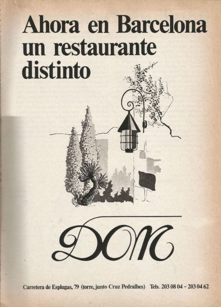 El Restaurant DOM es presentĂ al pĂşblic l’any 1977 com un reducte de pau i sensibilitat gastronòmica per a l’Ă nima i Ăşnic de Barcelona classificat amb 5 forquilles, ja que els altres clĂ ssic de la ciutat, com el Via Veneto, Finisterre i Reno, declarevem 2 forquilles per pagar menys impostos.