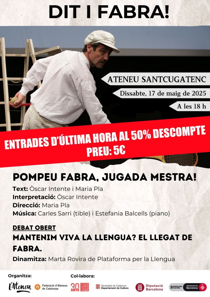 L’obra de teatre “POMPEU FABRA, JUGADA MESTRA!”. Una teatralització sobre la figura intel·lectual, humana i política del geni ordenador de la llengua: Pompeu Fabra. Amb Òscar Intente i Maria Pla. Una càpsula teatral i didàctica per explicar tot un moment històric viscut a Catalunya.