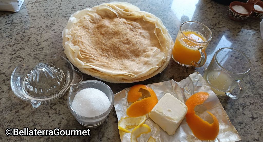 Ingredients per a 4 persones 8 crėpes fines plegades en forma de ventall 50g de mantega 25g de sucre fi Suc d’una taronja Suc de mitja llimona Pell sencera d’una taronja Pell sencera d’una llimona Grand Marnier o Cointreau Brandi 100g de nata muntada sense sucre