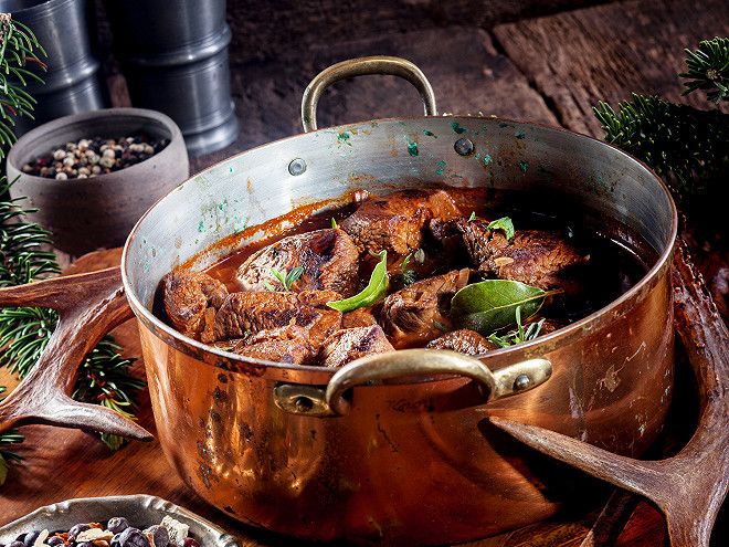 (Talleu la carn a trossos i poseu-la en una cassola poc profunda. Talleu les cebes i les pastanagues a rodanxes fines. Piqueu l’all i el julivert gruixudament. Afegiu les verdures, l’all picat, les herbes i l’oli a la carn. Salpebreu-ho i cobriu-ho amb vi. Deixeu-ho marinar durant almenys 12 hores.