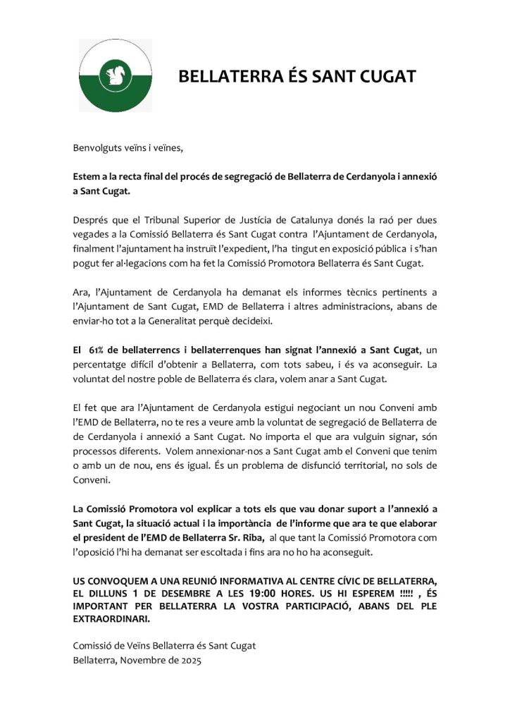US CONVOQUEM A UNA REUNIÓ INFORMATIVA AL CENTRE CÍVIC DE BELLATERRA, EL DILLUNS 1 DE DESEMBRE A LES 19:00 HORES. US HI ESPEREM!!!!!, ÉS IMPORTANT PER BELLATERRA LA VOSTRA PARTICIPACIÓ, ABANS DEL PLE EXTRAORDINARI.