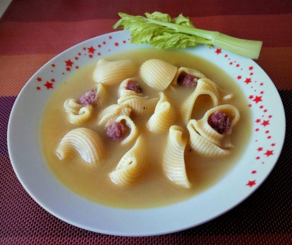 L’Escudella (el Primer Plat): El brou, ric i concentrat, servit amb la pasta de Nadal, els grans galets de grans dimensions que s’omplien amb carn picada (la pilota o altres carns).