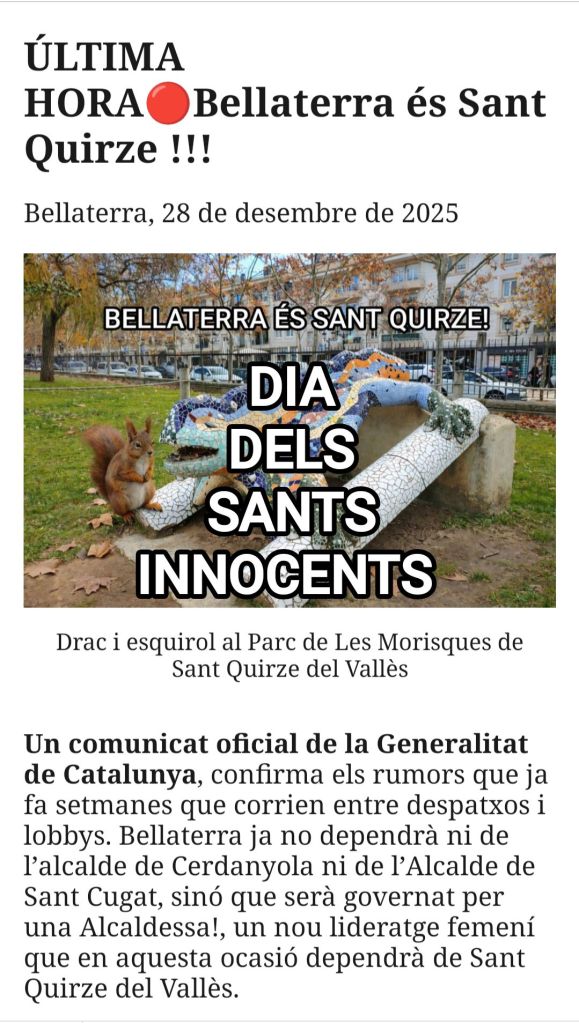 LLUUS TORRES ✍️ Ahir, 28 de desembre, la notícia sobre l’annexió oficial de Bellaterra a Sant Quirze del Vallès ha estat la innocentada de Bellaterra.Cat