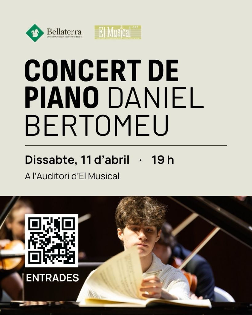Reserva d’entrades gratuites pel concert de piano ofert per Daniel Bertomeu Garrido el dissabte 11/04/2026 a les 19:00 hores al Conservatori Profesional de Música El Musical de Bellaterra (C/Ramon Llull, 16, Bellaterra).