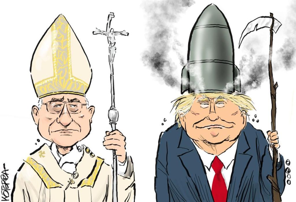 “Donald Trump va atacar el Papa Lleó XIV a les xarxes socials diumenge 12 d’abril, després que aquest últim es pronunciés en contra de la guerra a l’Orient Mitjà. (Vist per Koterba, EUA)“.