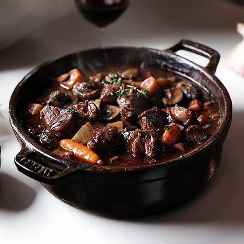 Preescalfeu el forn a 150 °C (300 °F). Escorreu el senglar i les verdures aromàtiques, mantenint-les separades. En una cassola de ferro colat apta per al forn, escalfeu una cullerada d’oli de cacauet (bastant calent). Salpebreu els daus de senglar amb sal i pebre acabat de moldre i daureu-los a la cassola per tots els costats. Això pot trigar de 6 a 10 minuts. Traieu el senglar de la cassola, desgreixeu-lo i poseu la cassola a foc lent. Afegiu-hi la mantega i les verdures aromàtiques ben escorregudes i deixeu-les suar durant uns 10 minuts. Afegiu-hi els daus de senglar, deixeu-los suar durant 4 minuts i desglaseu-los amb el vi negre de la marinada. Afegiu-hi els sucs del senglar, porteu-ho a ebullició, tapeu-ho i poseu-ho a un forn a 140 ° graus. Coeu-ho durant almenys 2 hores i 30 minuts.