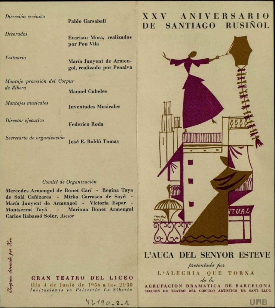 LLUÍS TORRES| Bellaterra, 3 febrer 2024 A l’edició del Diario de Burgos, del dimarts, dia 5 de juny de 1956, a la seva pàgina 5, hem trobat una interessant crònica de de Martín Canigó, sobre la representació de L’Auca del senyor Esteve, celebrada al Gran Teatre del Liceu, el dimecres, 4 de juliol de 1956, a les 21:30 hores, que va dirigir el bellaterrenc Frederic Roda -creador de l’Agrupació Dramàtica de Barcelona- (ADB), amb la participació estelar de seva esposa, Maria Rosa Fàbregas, en el paper de Tomaseta. Frederic, apart de dirigir-la, va interpretar el paper principal del senyor Esteve.