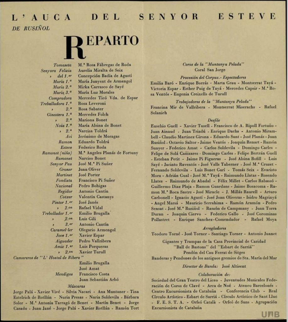 El senyor “Esteve”, a l’esforç i l’obstinació del qual es deuen moltes de les institucions artístiques i culturals espreses de Barcelona, el mateix Gran Teatre del Liceu és un exemple de l’obra que va deixar l’arquitecte de Rusiñol serà representat per l’advocat barcelonès, don Frederic Roda, qui també té cura de la direcció general de l’obra. La seva dona, la senyora Maria Rosa Fabregas de Roda li donarà la rèplica al principal paper femení. El senyor Pau, una altra de les figures més populars de la comèdia de Rusiñol, serà personificat pel degà de la Facultat de Dret, el catedràtic el senyor José Maria Pi i Sunyer. Un especialista en psiquiatria infantil, el prestigiós doctor Jeronimo Moragas, exercirà paper de l’avi, en què s’advertirà el curiós afany d’evadir-se del món de la seva especialitat científica. L’il·lustre mestre Don Eduardo Toldrá, director de l’Orquestra Municipal, té a càrrec seu el personatge de “senyor Ramón”. La distingida “liederista Concepció Badiad’Agusti encarnarà la “veïna del primer pis”: Altres danses barcelonines, com la senyora Aurèlia Miralla de Seix i la senyora Maria Junyet d’Armengol, assumeixen la responsabilitat d’altres importants papers. L’editor José Janés, té també un personatge popular a càrrec seu: el del cotxer.