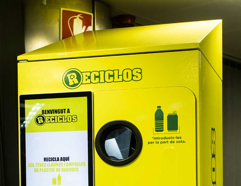 - Aquestes màquines de reciclatge formen part de RECICLOS, el Sistema de Devolució i Recompensa (SDR) desenvolupat per Ecoembes, que també funciona als contenidors grocs de 16 municipis de Catalunya.