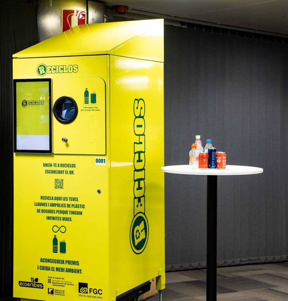 Aquestes màquines de reciclar formen part de RECICLOS, el Sistema de Devolució i Recompensa (SDR) desenvolupat per Ecoembes i pel qual, a més de cuidar el medi ambient donant una segona vida a aquests residus, els ciutadans rebran recompenses amb les quals fomentar el transport sostenible (participant en sortejos per aconseguir bitllets de tren o patinets elèctrics) o ajudar els que més ho necessiten (contribuint a ajudar al Banc d’Aliments de Catalunya), entre d’altres. Aquest sistema ja funciona als contenidors grocs de 16 municipis catalans.