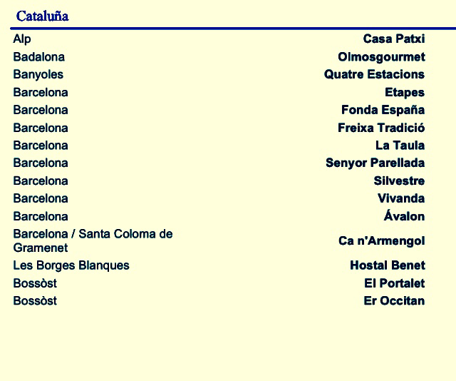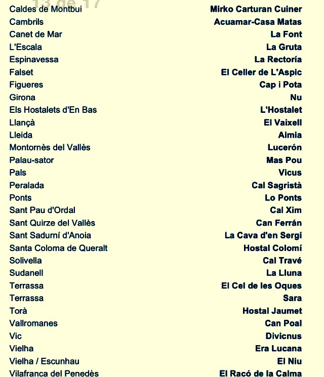 Posted in Uncategorized, tagged Acuamar-Casa Matas, Alp, Amaré, Areu, Avalón, Banyoles, Barcelona, Bellaterra, Bib Gourmand, Blanes, Cal Poal, Cal Sagristà, Cal Travé, Cal Xim, Cambrils, Can Roca, Casa Patxi, El Celler de l'Aspic, El Niu, El Racó del Cargol, Els Hostalets d'en Bas, Els Puis, Era Lucana, Escunhau, Esponellà, Etapes, Falset, Freixa tradició, Girona, Guia Michelin, Guia Michelin 2013, Hostal Jaumet, Itxas-Begi, L'Hospitalet de l'Infant, L'Hospitalet del llobregat, L'Hostalet, La Cava d'en Sergi, La Font, La Lluna, La Taula, Lleida, Mandarina, Mas Pou, Miami Can Pons, Mirko Canturan, Palau-Sator, Perelada, Quatre Estacions, Restaurants de Barcelona, Restaurants de Catalunya, Restaurants de Girona, Restaurants de Lleida, Restaurants de Tarragona, Roquetes, S'Auguer, Sant Carles de la Rapita, Sant Cugat del Vallès, Sant Pau d'Ordal, Sant Quirze del Vallès, Sara, Senyor Parellada, Silvestre, Solivella, Sudanell, Tarragona, Terrassa, Toc, Torà, Vall Ferrera, Vielha, Vivanda on 9 gener 2011| Leave a Comment »