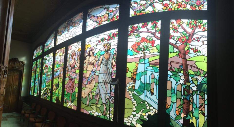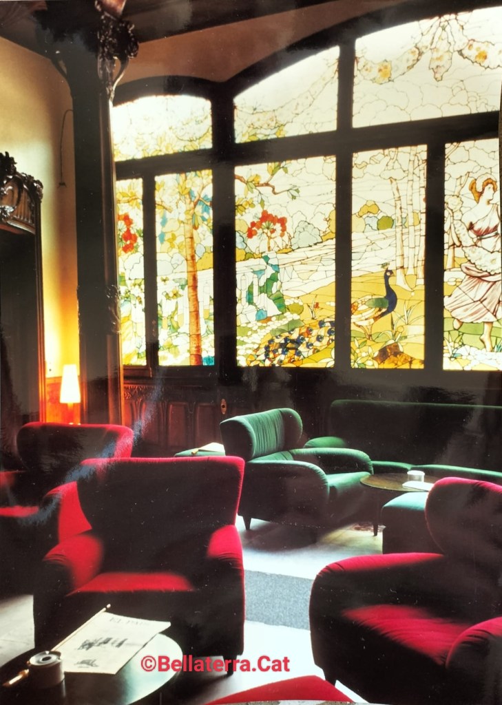 El vitrall modernista de grans dimensions, és la nineta dels ulls de la casa. Obra d’Antoni Bordalba (Barcelona, ?-1925), Vidrier modernista català format al taller d’Antoni Rigalt i Blanch. Ben aviat es va establir pel seu compte i del taller van sortir obres d’una gran qualitat. Els més importants són els vitralls que va realitzar per al Cercle del Liceu, sota la direcció d’Oleguer Junyent i amb dibuixos de Josep Pey. En aquests vitralls de tema wagnerià mostra un gran domini del dibuix de la grisalla i especialment un ús molt abundant del vidre anomenat americà o Tiffany.