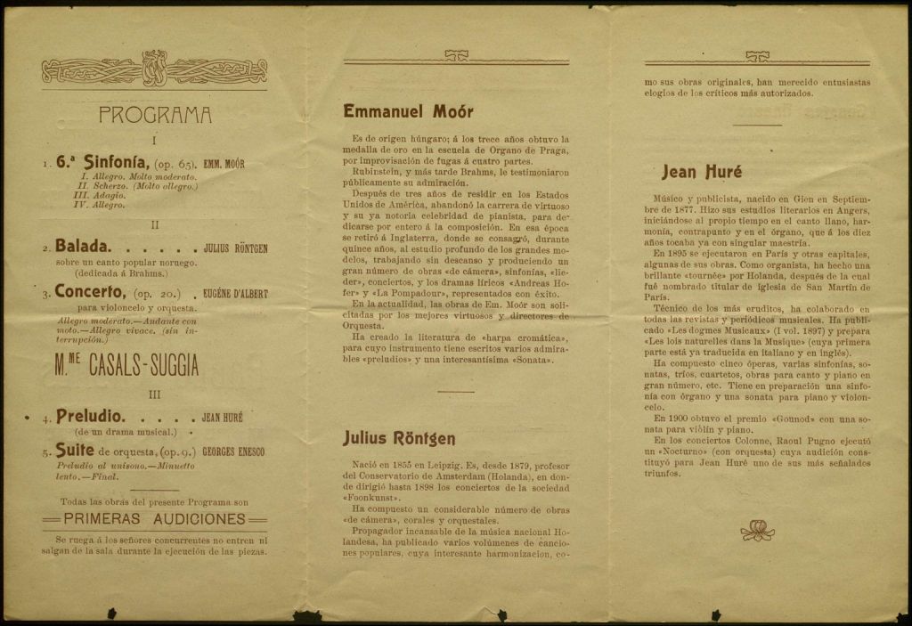 Potser sorprèn menys, per tant, que a Barcelona fos en un concert de Pau Casals que aparegués per primera vegada –si més no seguint la premsa de l’època– una obra d’Enescu en un programa. Al principi –segons múltiples anuncis apareguts el febrer del 1909– havia de ser una Rapsòdia romanesa; finalment, però, es tractà de l’esmentada Suite op. 9 núm. 1. El concert al qual ens referim pertanyia a la Temporada de Quaresma i era un dels que commemoraven el segon centenar d’audicions de l’Associació Musical de Barcelona. Va tenir lloc al Gran Teatre de Liceu el 18 de març de 1909; a més de Pau Casals, que hi debutà com a director d’orquestra a Barcelona, hi participaren la també violoncel·lista Guillerminha Casals-Suggia i l’Orquestra de l’Associació Musical, el director titular de la qual era Joan Lamote de Grignon. Suposant que no ens passi per alt cap altra audició, la Suite op. 9 núm. 1 va ser la primera obra d’Enescu interpretada en concert reportat per la premsa a Espanya.