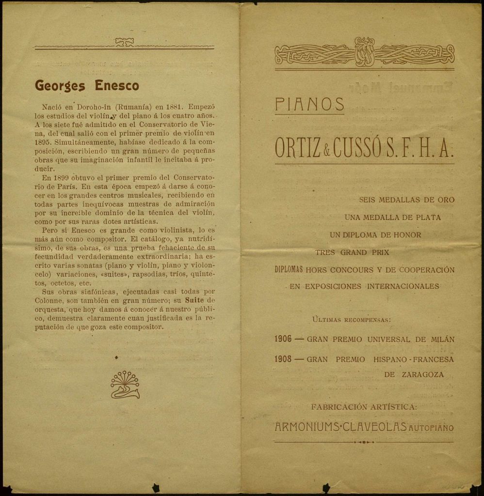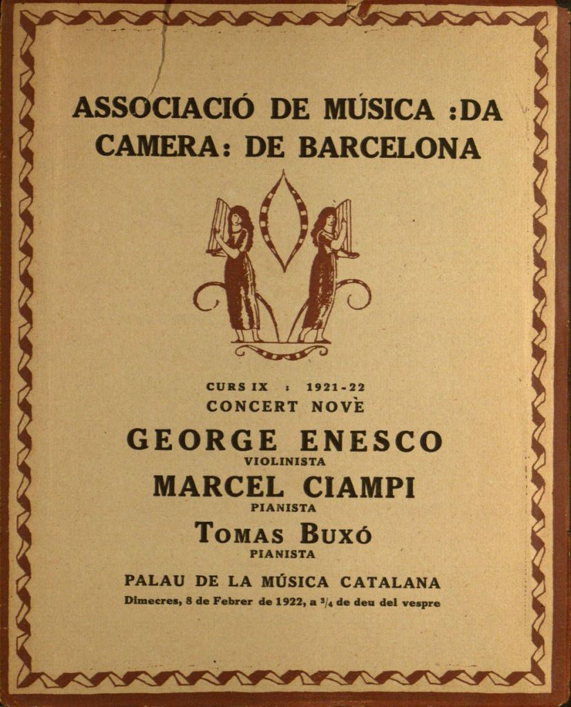 Que ens consti, Enescu va visitar per primera vegada Espanya el 1908, concretament Sant Sebastià, on donà dos concerts acompanyat per l’Orquesta Sinfónica de Madrid que dirigia Enrique Fernández Arbós, els dies 21 i 24 de juliol. El 1913 tornem a trobar indicis d’una vinguda; sens dubte tocà a Bilbao pel gener, però és menys clar que finalment tinguessin lloc els tres concerts que després havia de donar a Madrid, amb el pianista Maurice Dumesnil. Enescu tornà a visitar Espanya el 1922. Acompanyat pel pianista Marcel Ciampi, van donar concerts a les ciutats d’Oviedo, Sevilla, Madrid i Barcelona. La manera com s’avança la notícia a la premsa, que sol especificar que es tracta de la “presentació” de l’artista, sembla confirmar que era efectivament la primera vegada que venia, si més no, a Madrid i Barcelona. En cap dels concerts d’Enescu a la Península, almenys fins en aquell moment i fins on sabem, no s’hi van interpretar obres seves. Almenys a Barcelona, tampoc no hi donaren cap primera audició. Després de tocar a Madrid el 4 de febrer, van dirigir-se cap a Barcelona, on van tocar els dies 6 i 8.