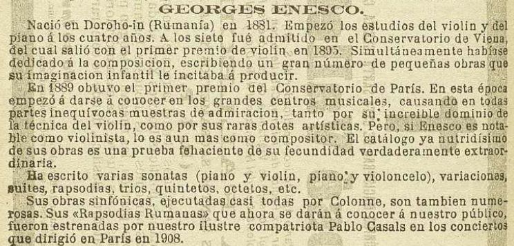 L’estrella no podia passar desapercebuda a l’aleshores corresponsal de la «Revista Musical Catalana» a París, Joaquim Nin, que ja el març del 1906 explicava que “ohí, ab veritable plaher, a n’en Georges Enesco, l’eminent y jove violinista rumà, interpretant la gran Chacona de J. S. Bach”. Nin i qui ocasionalment el substituïa en la tasca, Vicenç Maria de Gibert, feren breu esment d’actuacions d’Enescu amb motiu d’unes altres cinc cròniques parisenques entre els anys 1906 i 1907.