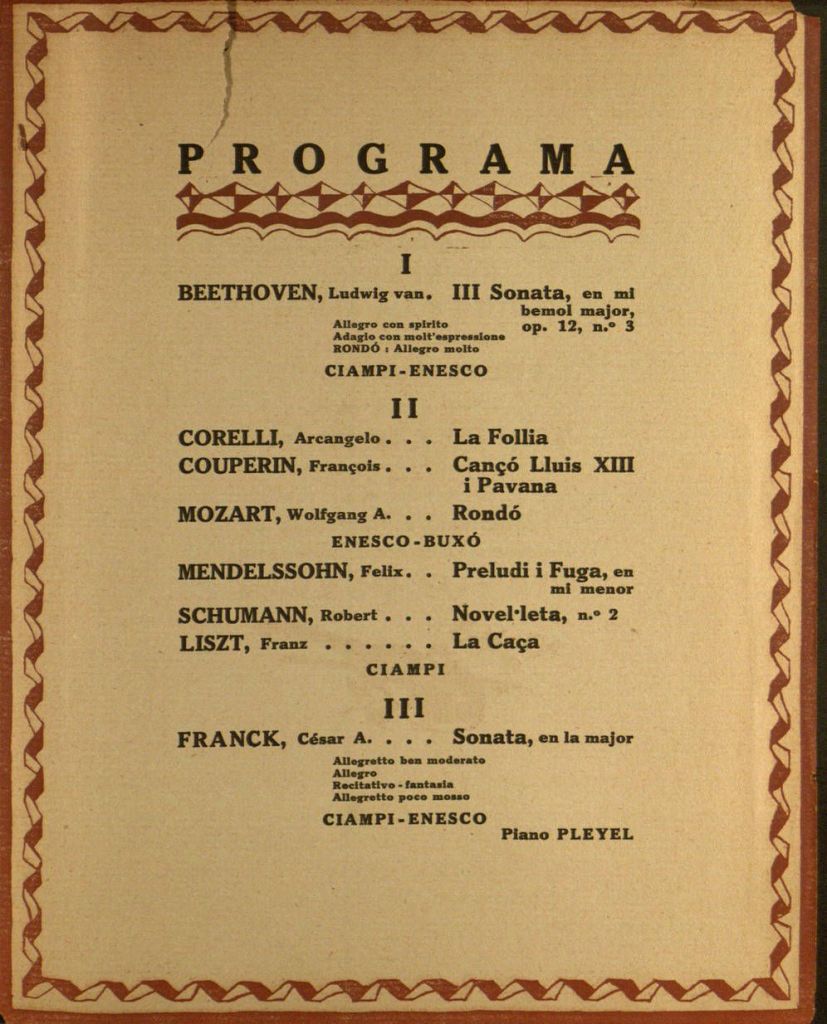Tots dos concerts havien estat organitzats per l’Associació Música da Camera. Mesos abans, però, possiblement romania una qüestió pendent d’esclarir, ja que també l’Associació Íntima de Concerts havia anunciat que tindria Enescu a la seva temporada. Ciampi sí que donà un concert el gener a Barcelona per a l’Íntima, dies abans de començar la gira amb Enescu; potser això sintetitzi el transcurs d’aquest afer. Els programes que portaren eren majoritàriament romàntics, amb alguna peça clàssica i algunes d’autors barrocs. Enescu va comptar també amb la col·laboració del pianista i compositor Tomàs Buxó, que ja acumulava notable prestigi i des del 1909 exercia com a professor a l’Escola Municipal de Música de Barcelona. Tots dos programes s’iniciaven amb una sonata, a càrrec de Ciampi i Enesco. A la segona part, se succeïen la intervenció d’Enescu-Buxó (si bé el dia 6 anà precedida d’una obra per a violí sol), i la de Ciampi en solitari amb obres d’autors romàntics. Finalment, la tercera part consistia en l’execució d’una segona sonata, de caire franckià.