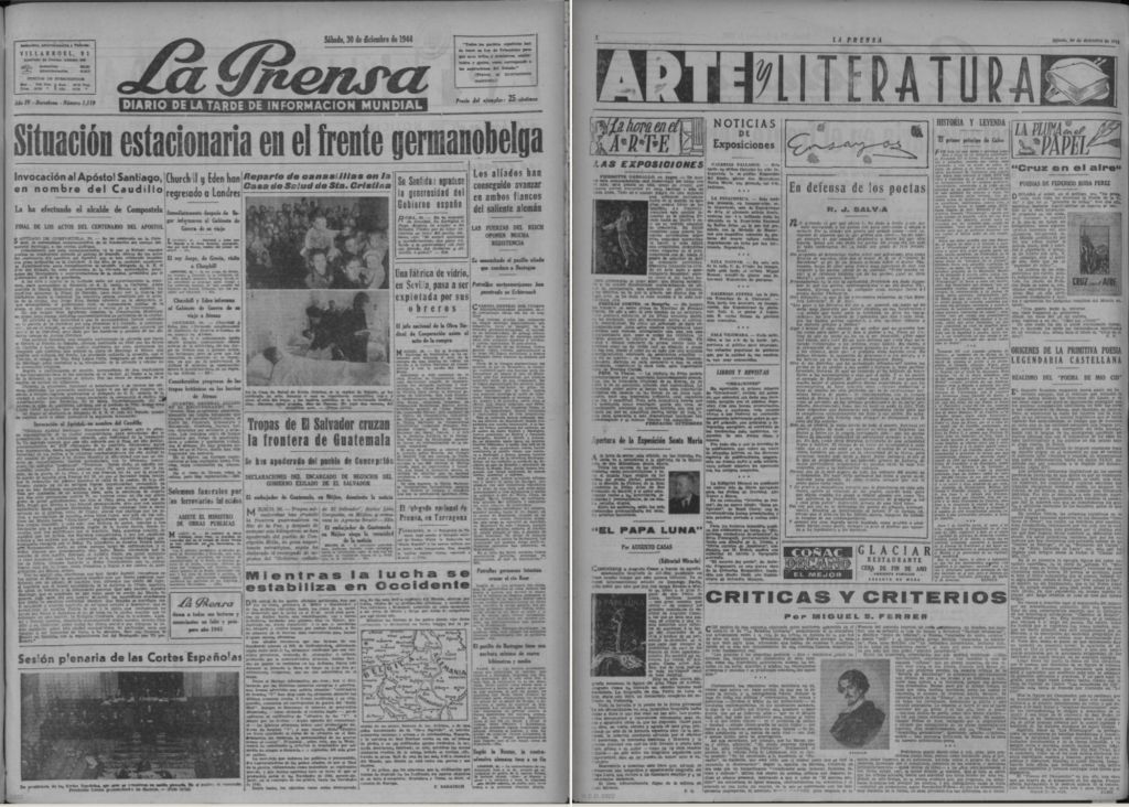 Crònica del primer llibre de poesies en castellà Cruz en el Aire de Frederic Roda Perez al diari La Prensa, dissabte dia 30 de desembre de 1944, pàgina 2.