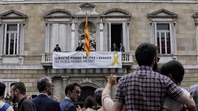 Pancarta a la façana de la Generalitat que reclama “llibertat presos polítics i exiliats” / CRISTINA CALDERER