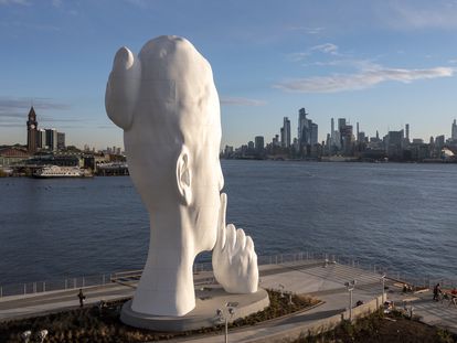 Water’s Soul (L’ànima de l’aigua), de l’escultor català Jaume Plensa, de 24 metres d’alçada i un pes de 30 tones, a Newport (Nova Jersey), mirant Manhattan|EL PAÍS